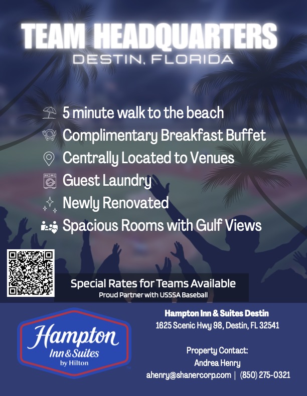 TEAMS CAN STAY WHERE THEY LIKE. WE ALSO DO HAVE A LOCAL HOTEL PARTNER THAT OFFERS USSSA TEAMS A SPECIAL DEAL WITH THE LINK BELOW